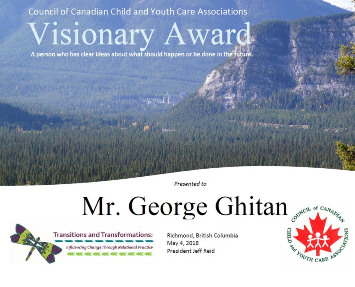 The Council of Canadian Child and Youth Care Associations Visionary Award was created in October 2014 at the annual general meeting. The purpose of the award was to honour and